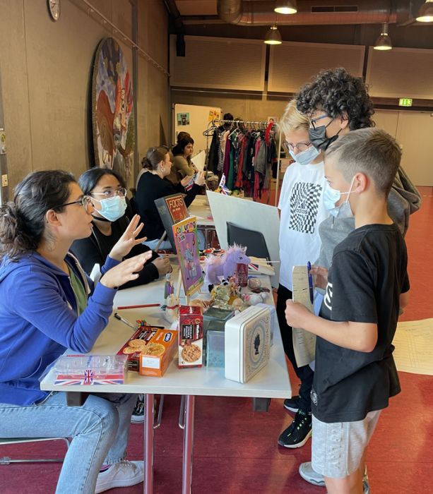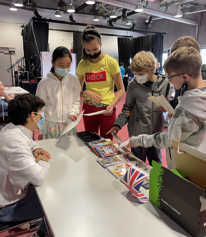Die Schülerinnen und Schüler der Englisch Leistungskurse begrüßten dort die Mitschülerinnen und Mitschüler der Klasse 6 an verschiedenen Stationen, in denen lebensweltliche und authentische Handlungssituationen erprobt werden konnten – in English only: buche ein Hotelzimmer, lass‘ den Akku deines Handys austauschen, iss etwas im Restaurant oder kaufe ein spannendes Kleidungsstück.
